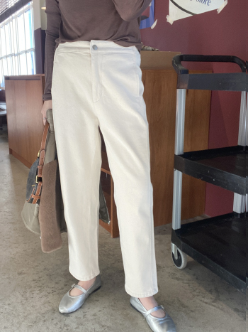 밑단 안쪽으로 옆트임이 더해져 유니크한 무드를 자아내는 하이웨스트 라인의 데님팬츠