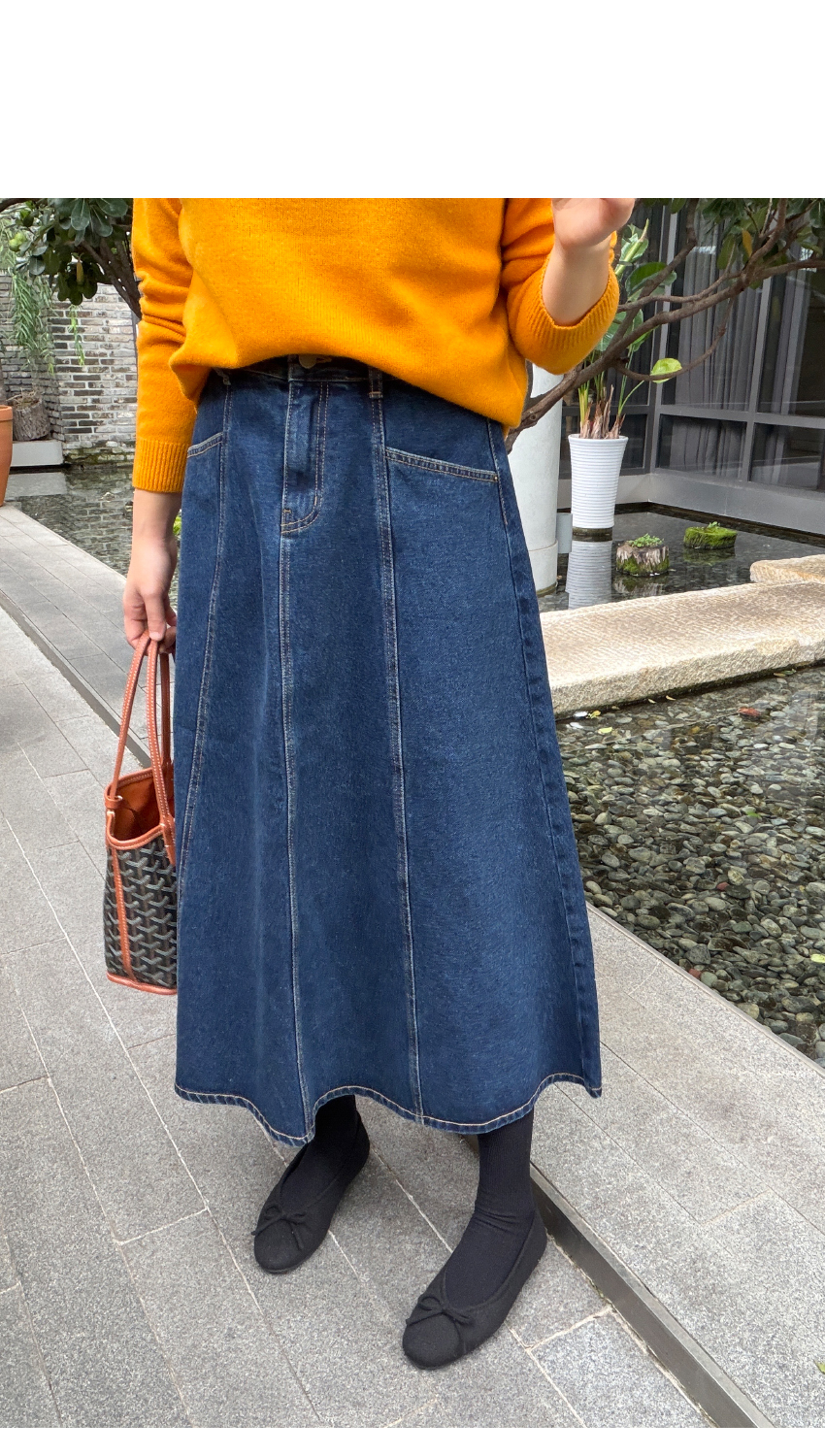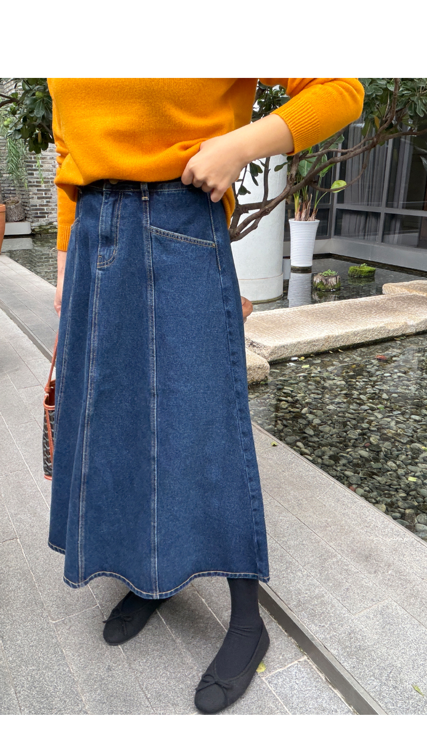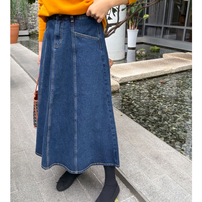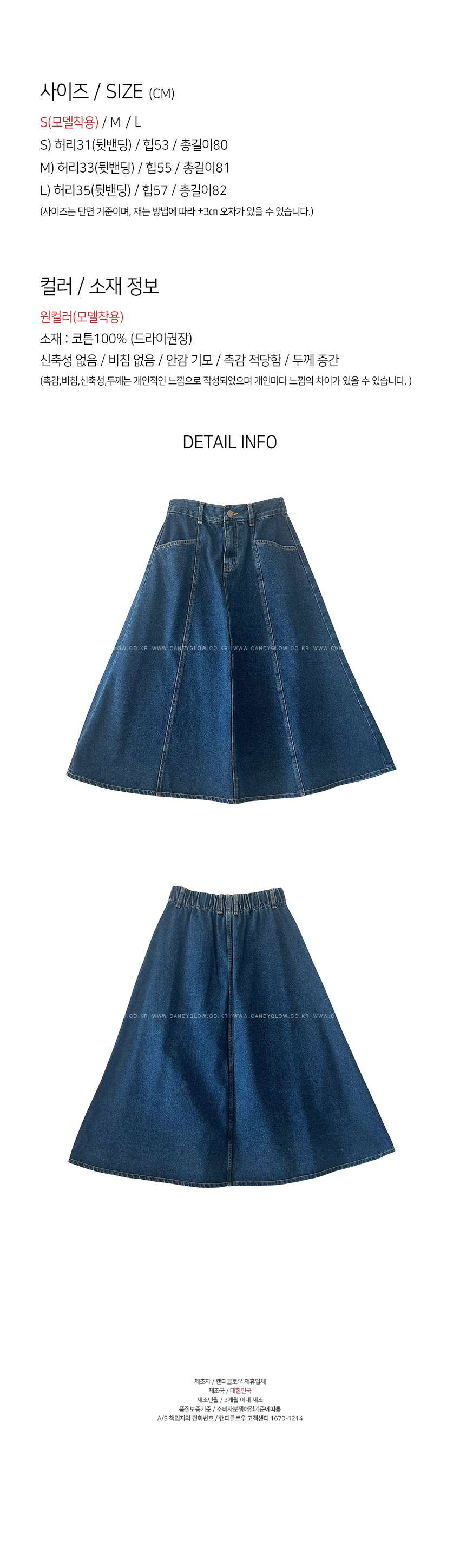 언제나 사랑받는 데님스커트를 소개해드려요,차분하면서도 데일리해 자주 손이가는 제품인데요,롱한 기장에 A라인으로 떨어지는 실루엣으로네추럴하면서도 멋스럽게 매치하기 좋구요,허리뒷밴딩으로 편안한 착용감을 선사해드립니다자유로운 활동성을 보장해드리며,안감이 기모로 제작되어 따듯하게 즐기실 수 있어요,유행에 구애없는 데일리템으로 사심담아 추천드릴게요,컬러는 원컬러로 진행되며,사이즌는 S,M,L 총 3사이즈까지 진행되어요,평소 27사이즈 착용하는 저는 S사이즈로 착용해준 핏이구요,사이즈는 개인마다 차이가 있으니,정확한 사이즈는 상세표를 참고해주세요!