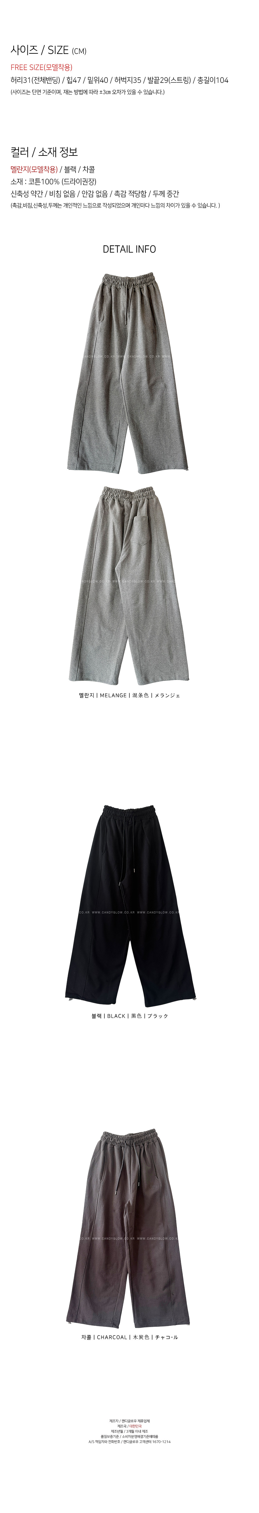 밑단 스트링이 더해져 와이드일자핏부터 조거핏 투웨이로 즐기실 수 있구요,편안하면서 스타일까지 챙긴 데일리템으로 추천해드릴게요,컬러는 멜란지,블랙,차콜 총 3가지 컬러로 입고해보았구요,사이즈는 프리사이즈로 25-30사이즈까지 추천해드리며,정확한 사이즈는 상세표를 참고해주세요,