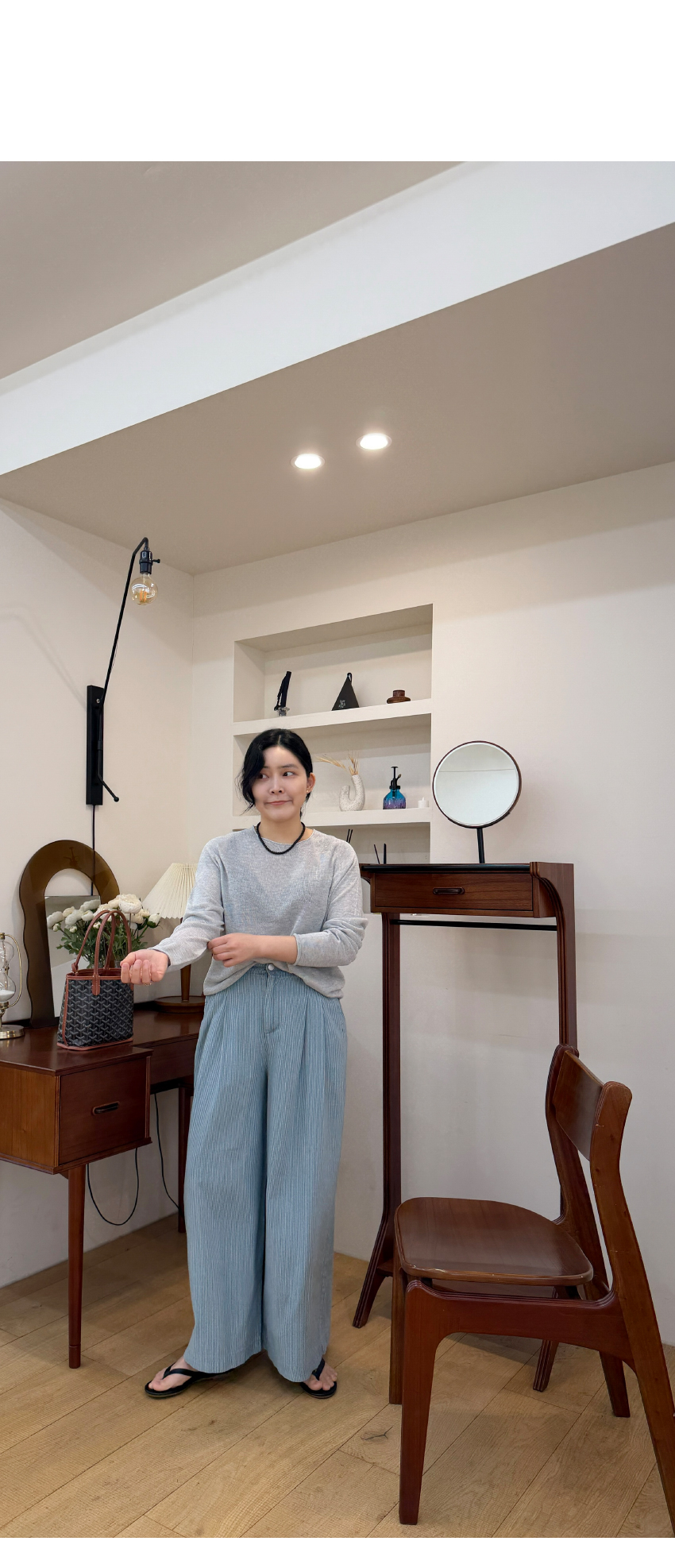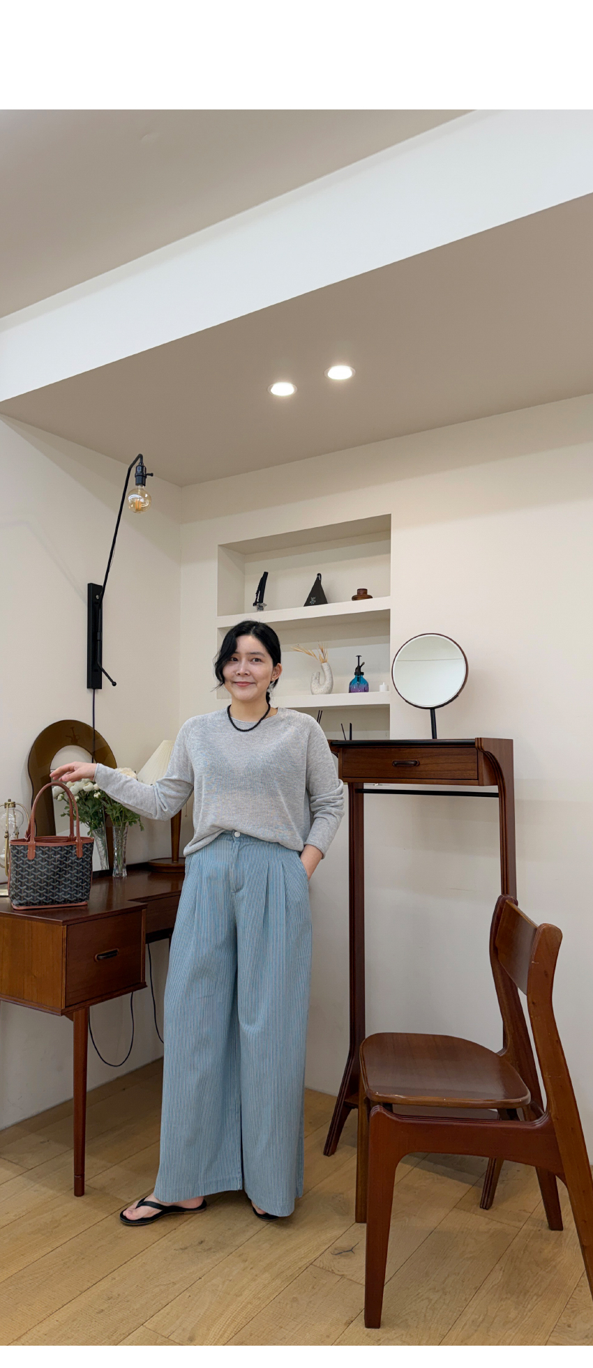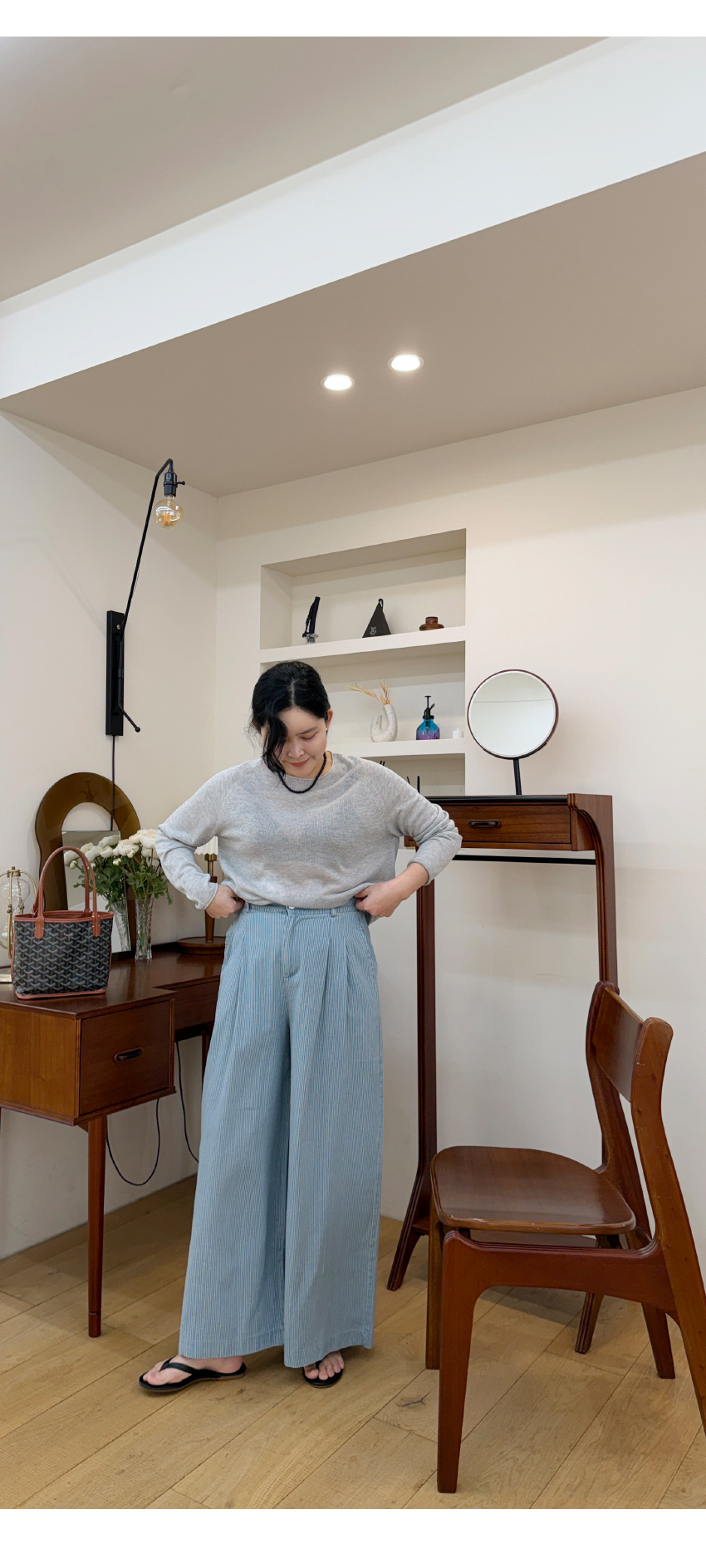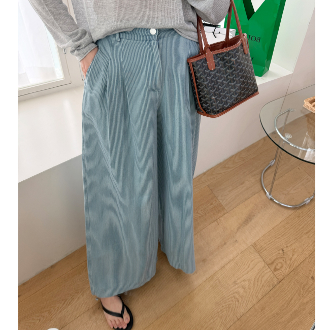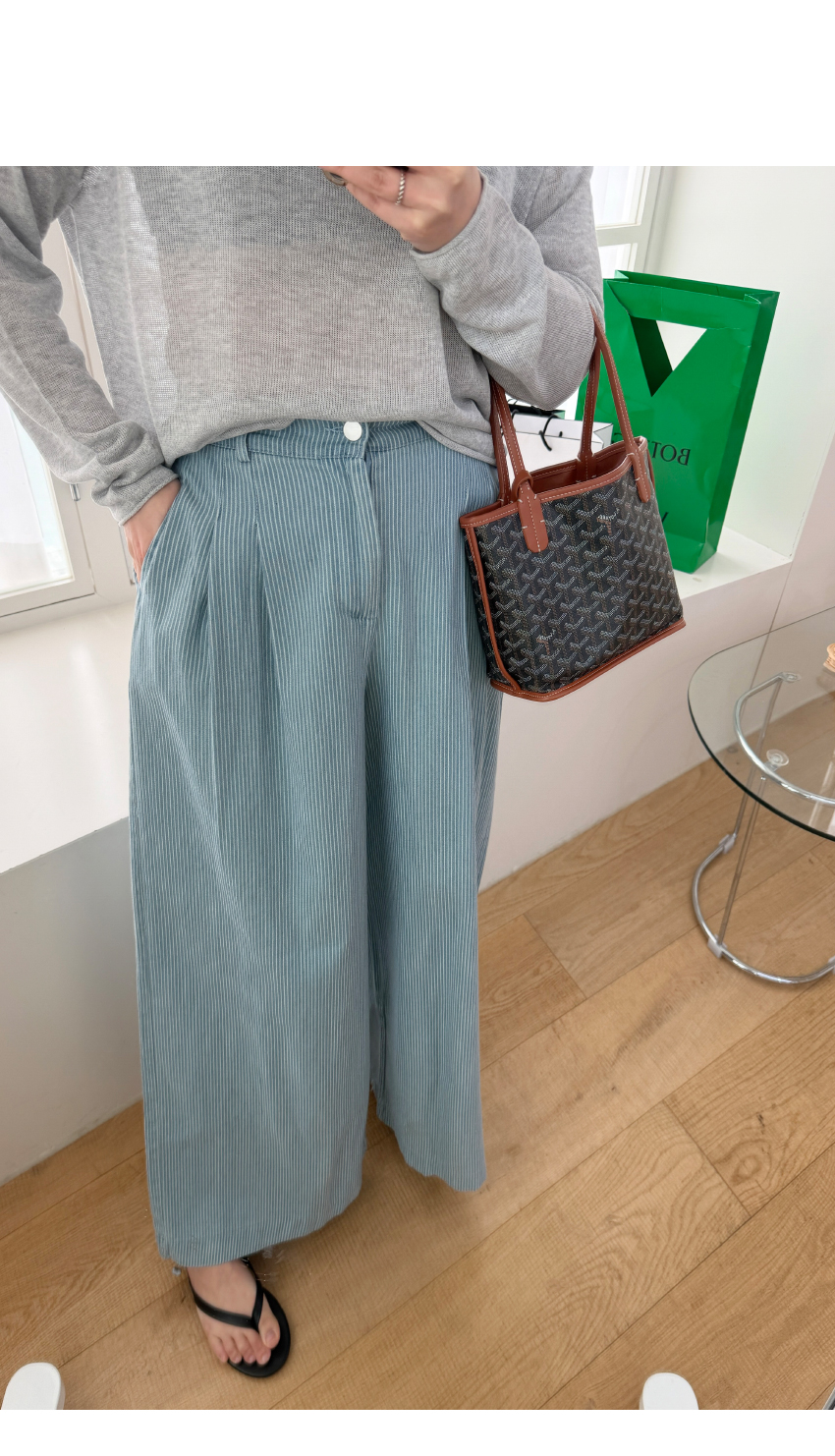 스트라이프 데님라인입니다, 네추럴무드의 와이드한 라인을 자랑하는데요,포멀한룩에서 캐주얼까지 다양한 스타일링에코디하기 좋은아이템입니다,신축성 없는 소재로 쉐입의 변형을 덜어주며,롱한 레그라인을 연출해드리구요,허리뒷부분이 밴드로 제작되어 편안함은 물론,스트라이프 나염이 더해져 은은한 포인트가 되어드려요.다양한 상의템과 코디가 이지한 데일리템으로하나쯤 소장하시길 사심담아 추천드릴게요,