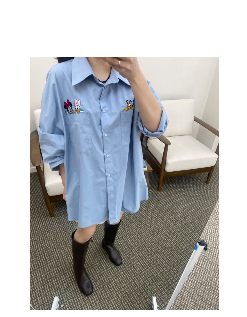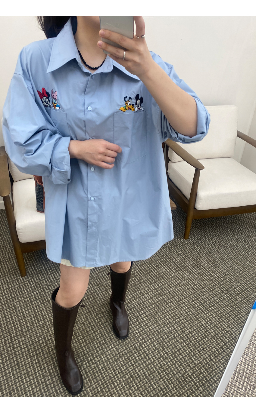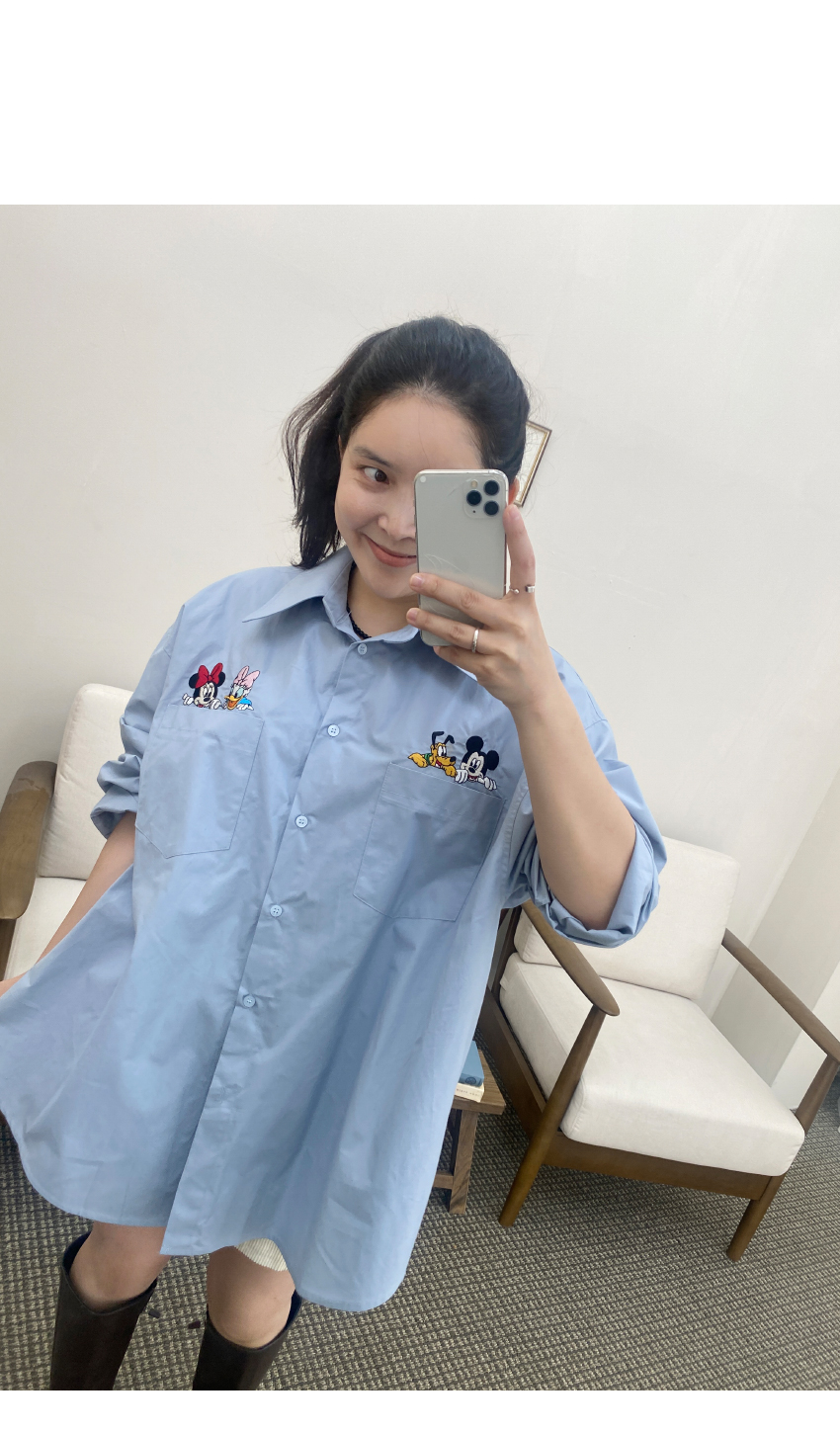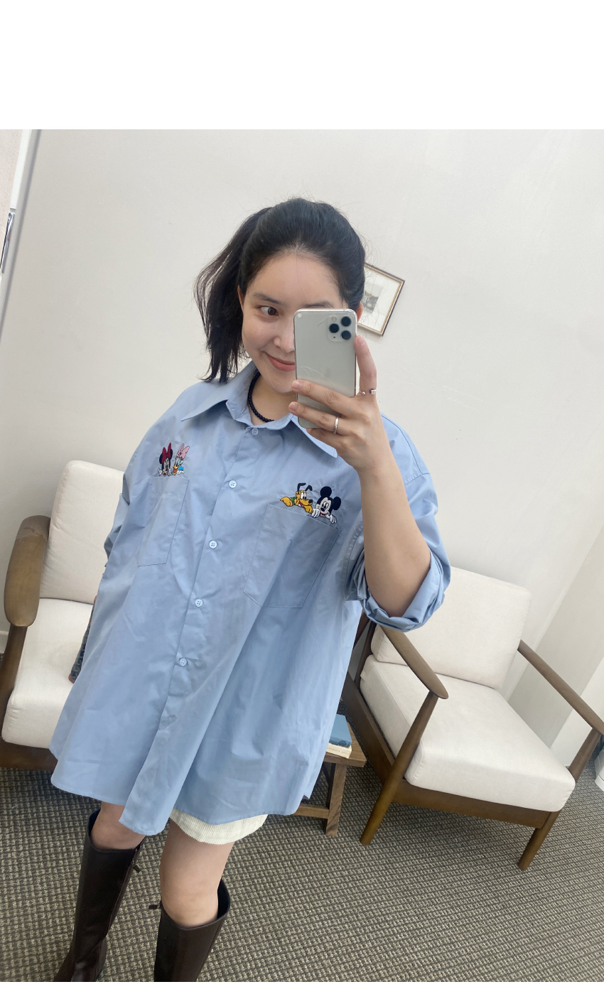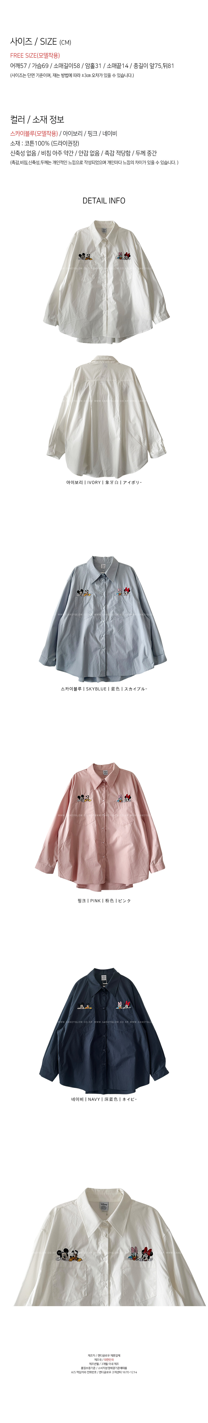 가을시즌 소장하셔야 할 셔츠를 소개해드려요,코튼소재로 베이직한 무드를 어필해주는 아이템인데요,,박시넉넉한핏으로 네추럴한 실루엣을 연출해드리며,세련된 컬러감이 다양한 분위기를 더해드려데일리룩부터 포멀한룩까지 다양한 스타일링이 가능한 아이템이에요,귀여운 디즈니캐릭터가 더해져 은은한 포인트가 되어드리며,베스트나,가디건 등 레이어드 셔츠로도 이지합니다,데일리템으로 사심담아 추천드릴게요,컬러는 아이보리,네이비,스카이블루,핑크총 4컬러로 준비해보았구요사이즈는 프리사이즈로 44-77 사이즈까지 추천해드리며,정확한 사이즈는 상세표를 참고해주세요,