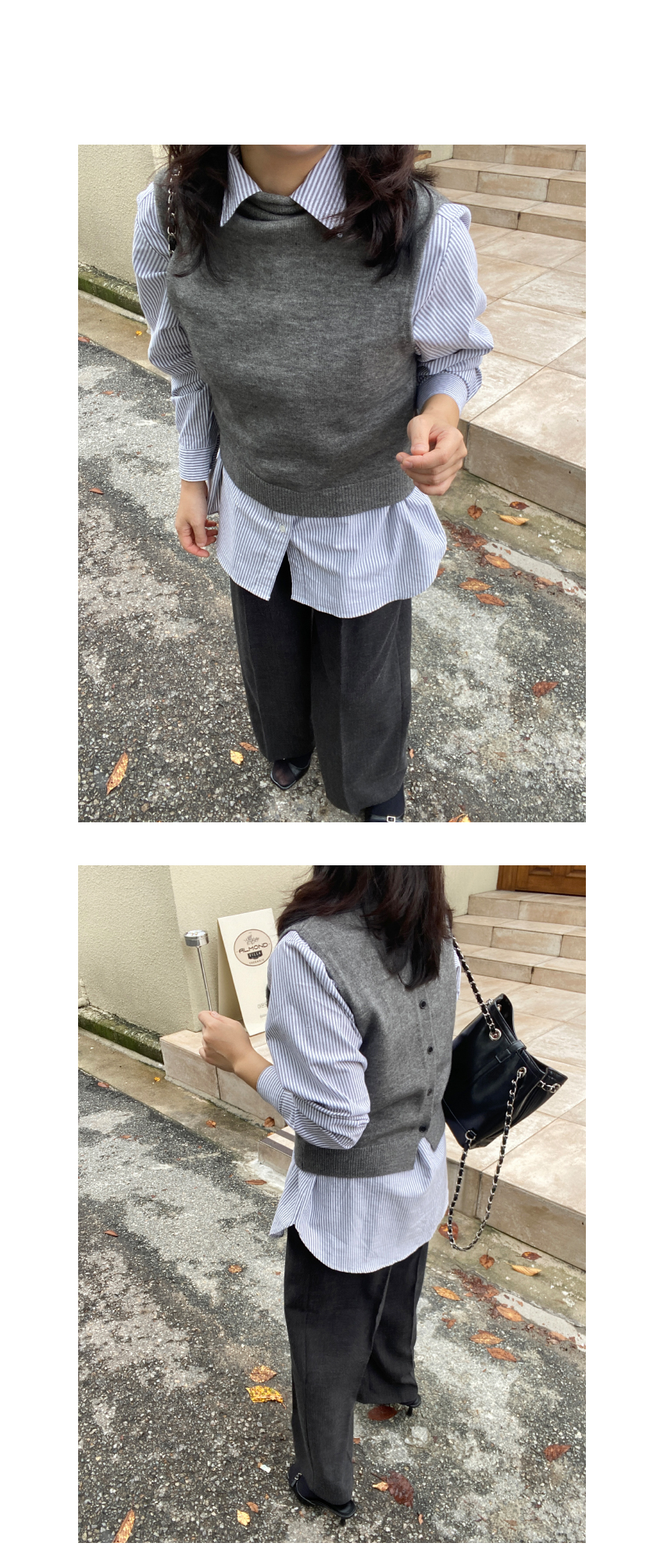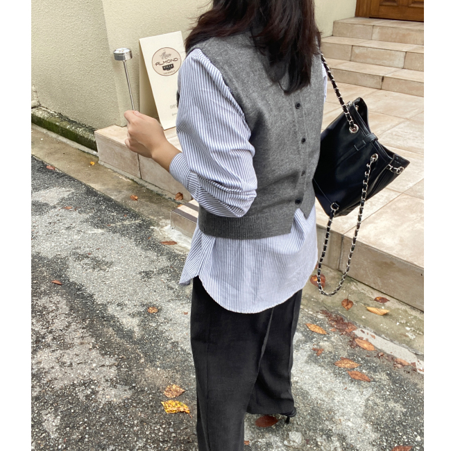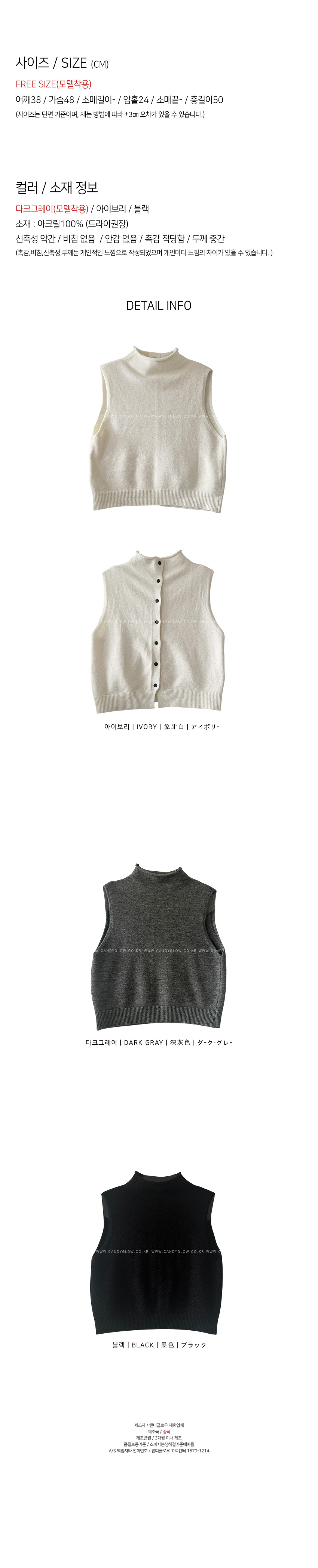 부드러운 텍스처의 베스트를 소개해드려요,페미닌한 분위기의 네추럴아이템이에요,니트소재로 보온성과스판성이 느껴지는 소재로 편안한 착용감을 선사해드립니다,단추로 간편한 클로징을 도와드리며,앞,뒤 구분없이 즐기실 수 있어요,하이넥으로 넥라인을 부드럽게 감싸주어 부담없는 착용감을 느끼실 수 있구요,유행에 구애없이 즐겨주세요,컬러는 블랙,아이보리,다크그레이 총 3컬러로 준비해보았구요사이즈는 프리사이즈로 44-66사이즈까지 추천해드리며,정확한 사이즈는 상세표를 참고해주세요,