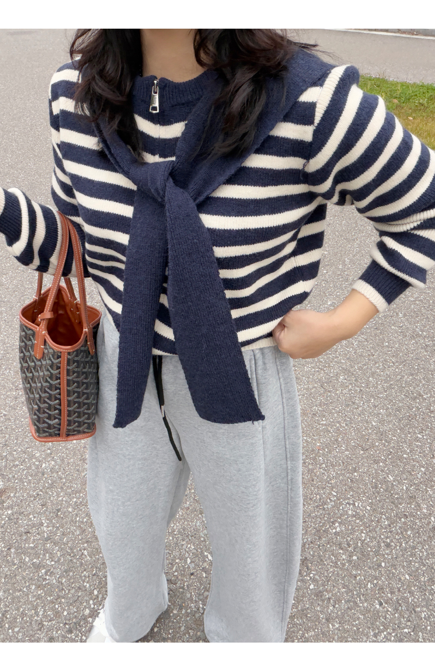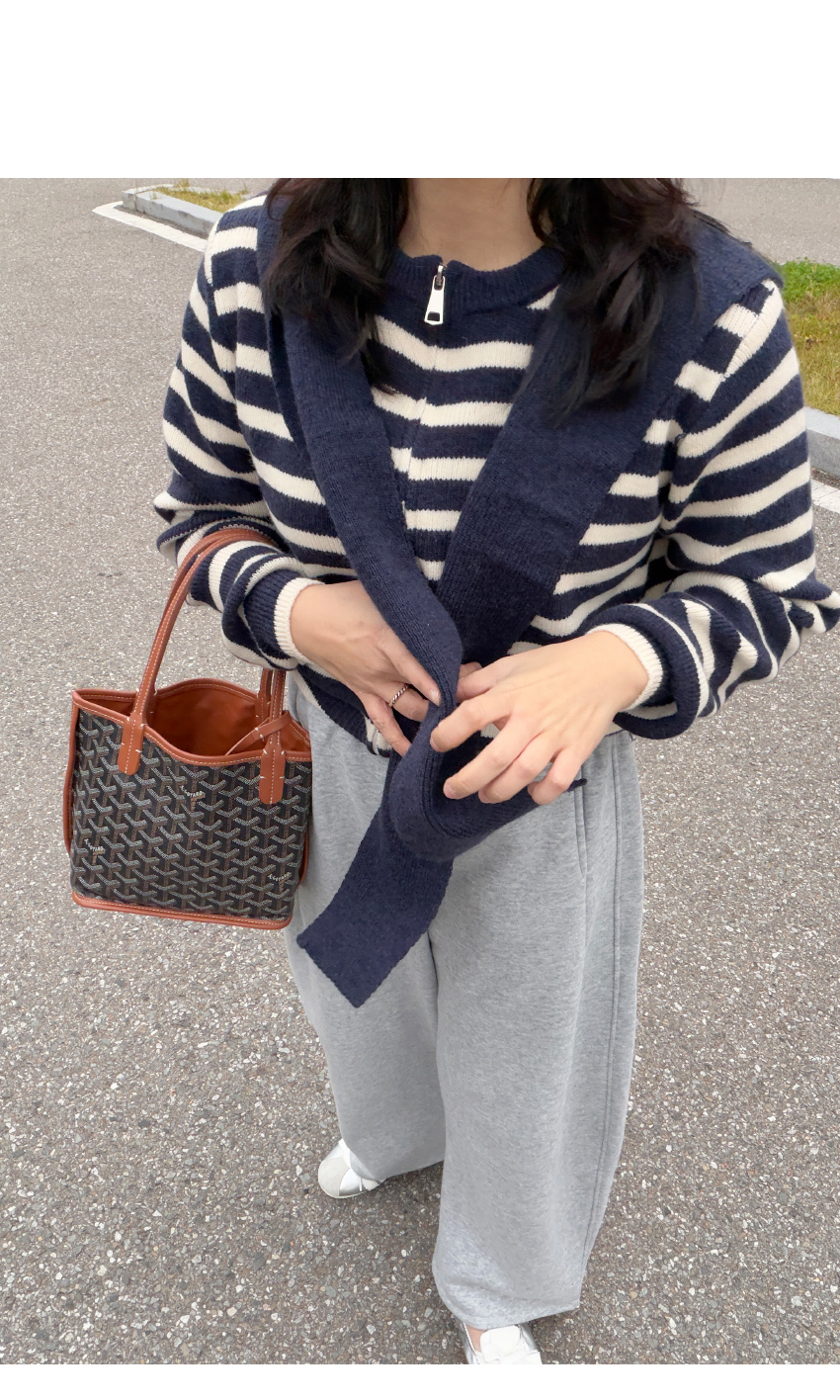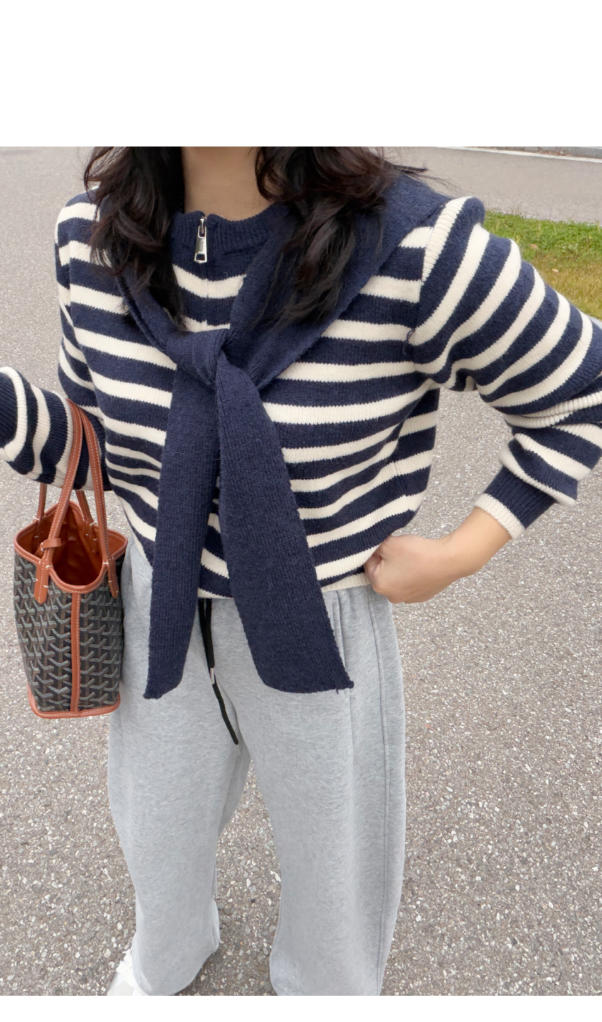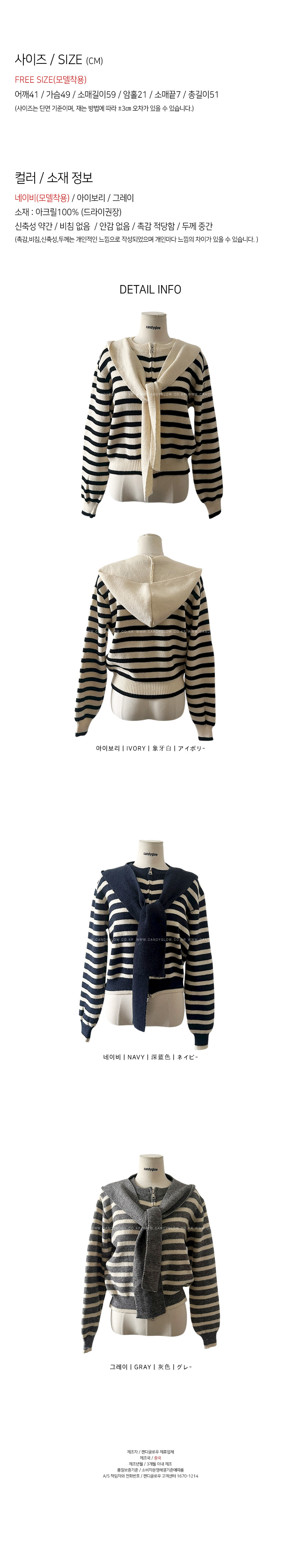 데일리로 활용하기 좋은 스트라이프 니트에요,소프트한 착용감으로 아주 부드러운 텍스처를 자랑하는 아이템입니다기본에 충실한 디테일에 라운드 넥으로 보다 더 깔끔한 실루엣을 연출해드리며,앞중심 지퍼로 간편한 클로징을 도와드립니다후드넥이 마련된 머플러가 세트로 제작되어 가성비는 물론,캐쥬얼한 실루엣으로 센스있게 즐기기 좋아다양한 아이템과 두루두루 매칭하기 편하실거에요,컬러는 그레이,네이비,아이보리 총 3컬러로 준비해보았구요,사이즈는 프리사이즈로 44-66사이즈까지 추천해드리며,정확한 사이즈는 상세표를 참고해주세요,