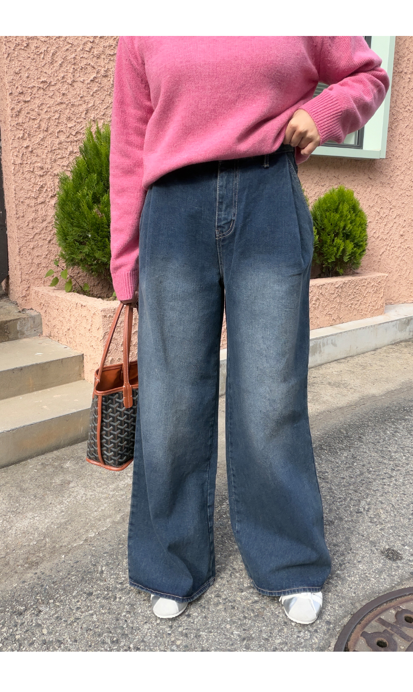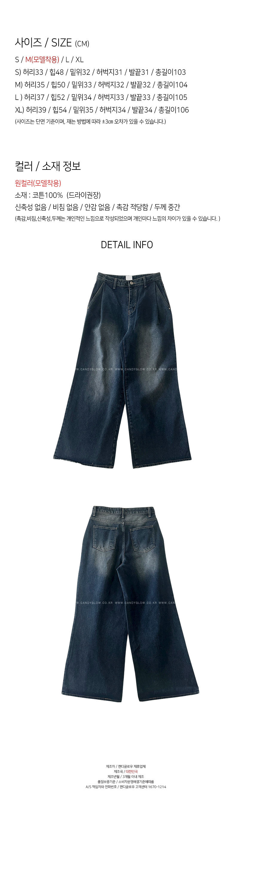 포멀한룩에서 캐주얼까지, 다양한 스타일링이 가능한 데님팬츠입니다,와이드한 일자핏으로 체형커버는 물론,앞면핀턱라인이 은은한 포인트를 더해드리며,신축성 없는 소재로 쉐입의 변형을 덜어주어요,티셔츠 단독 하나에 코디해주어도 은은한 멋이 느껴지는 아이템이구요,시즌리스로 4계절 내내 데일리템으로 즐겨주세요,컬러는 원컬러로 진행되구요,사이즈는 S,M,L,XL 총 4가지 사이즈로 준비해보았어요,평소 27사이즈 착용하는 저는 M사이즈로 착용해준 핏 이구요,개인마다 사이즈차이가 있으니,정확한 사이즈는 상세표를 참고해주세요