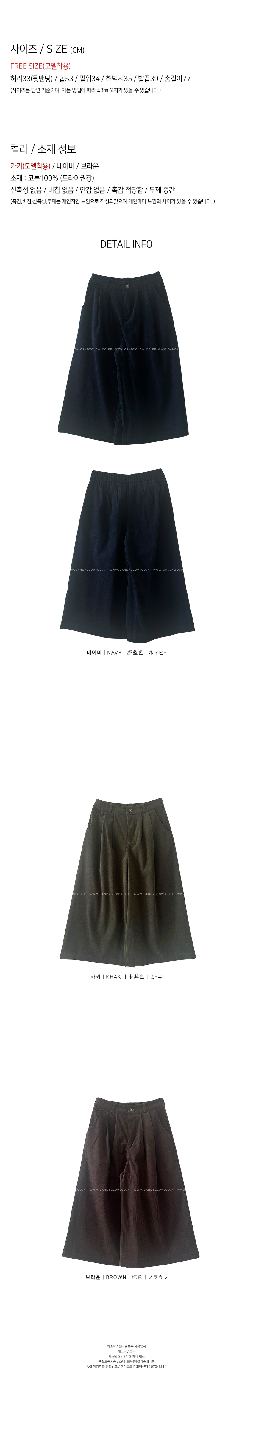 데일리한 무드의 골덴팬츠에요,와이드핏으로 네추럴한 실루엣을 연출해드리며,골덴소재로 보온성은 물론,양사이드 리얼포켓으로 실용성까지 챙겨주었어요,허리뒷부분이 밴딩으로 편안함을 느끼실 수 있구요,다양한 상의아이템과 코디하기 이지한 데일리템입니다,하이웨스트라인으로 미운 허리군살을 쏙-커버해드리며,유행에 구애없이 꾸준히 즐겨주세요,컬러는 네이비,브라운,카키 총 3컬러로 준비해보았구요사이즈는 프리사이즈로 25-30 사이즈까지 추천드릴게요,개인마다 사이즈 차이가 있으니,정확한 사이즈는 상세표를 참고해주세요,