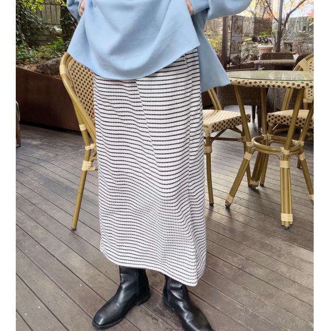 캐주얼스커트를 소개해드려요,데일리한 스트라이프패턴으로 자주 손이가는 아이템입니다,롱한 기장에 H라인으로 떨어지는 실루엣으로네추럴하면서도 멋스럽게 매치되구요,허리부분이 밴드로 제작되어 편안함을 느끼실 수 있습니다,
