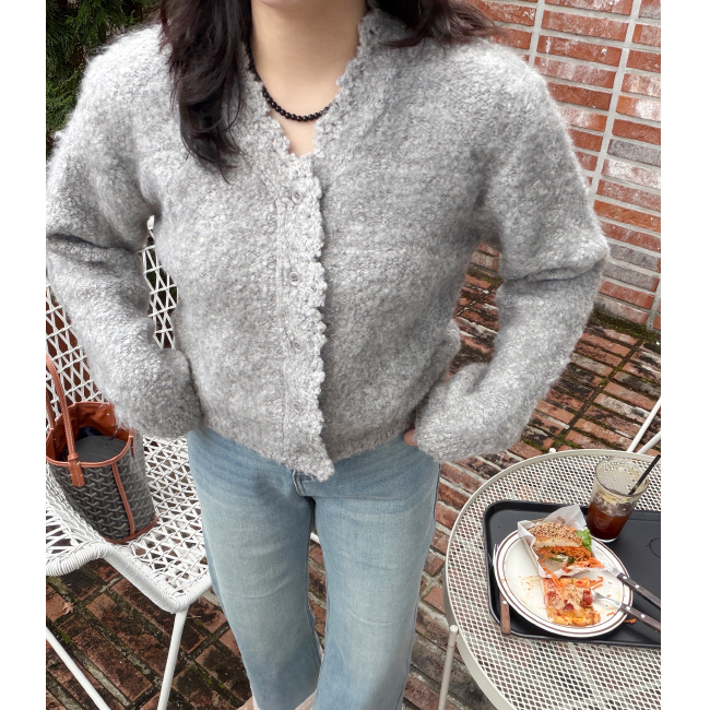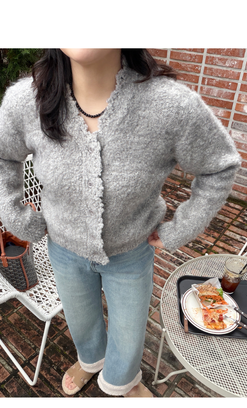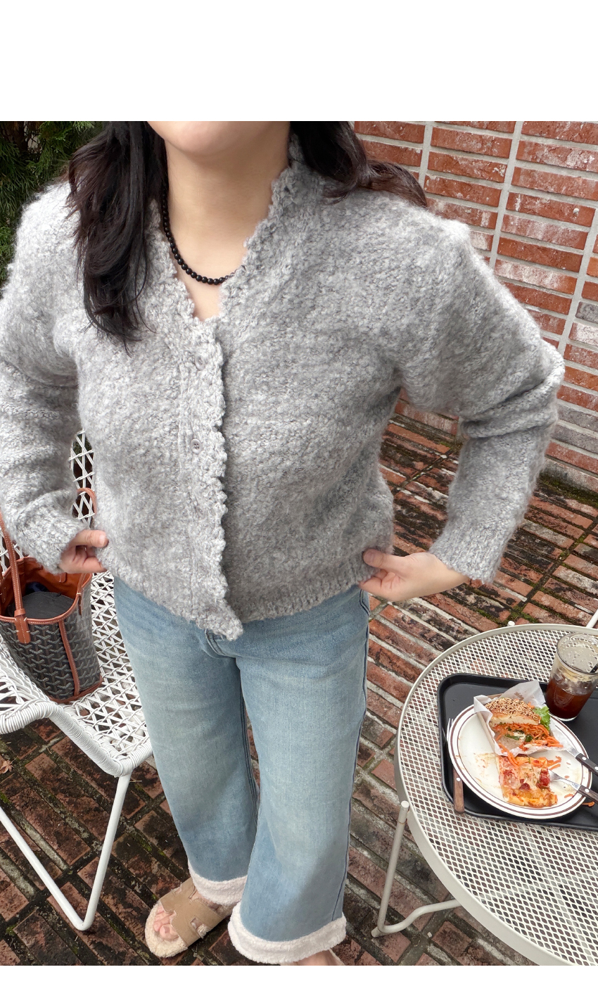 페미닌한 무드의 니트 가디건이에요.브이넥라인의 베이직한 무드와유니크한 분위기를 연출해드립니다,울소재가 50% 함유되어 보온성은 물론,부드러운 텍스처로 피부가 예민하신 분들도