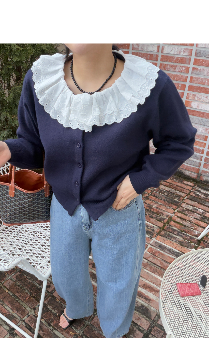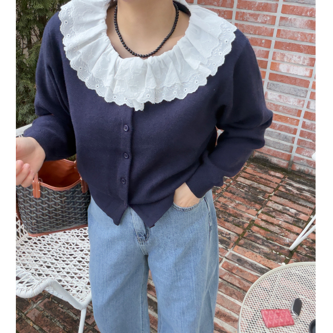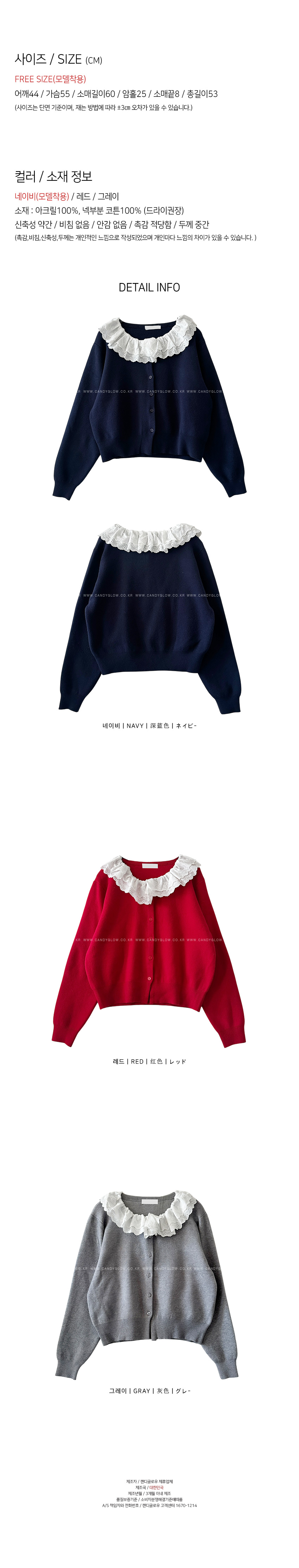 페미닌한 무드의 감도를 높여드릴 가디건이에요,심플한 실루엣으로 여성스러운 무드를 어필해드리는 제품입니다,앞중심 단추로 간편한 클로징을 도와드리며, 깔끔한 실루엣을 연출해드려요,네크라인부터 떨어지는 프릴레이스가 은은한 포인트가 되어드리며, 부드러운 텍스처로 편안한 착용감은 물론,슬랙스부터 데님,스커트까지 다양하게 즐겨주세요,컬러는 그레이,네이비,레드 총 3컬러로 준비해보았구요사이즈는 프리사이즈로 44-66사이즈까지 추천해드리며정확한 사이즈는 상세표를 참고해주세요!