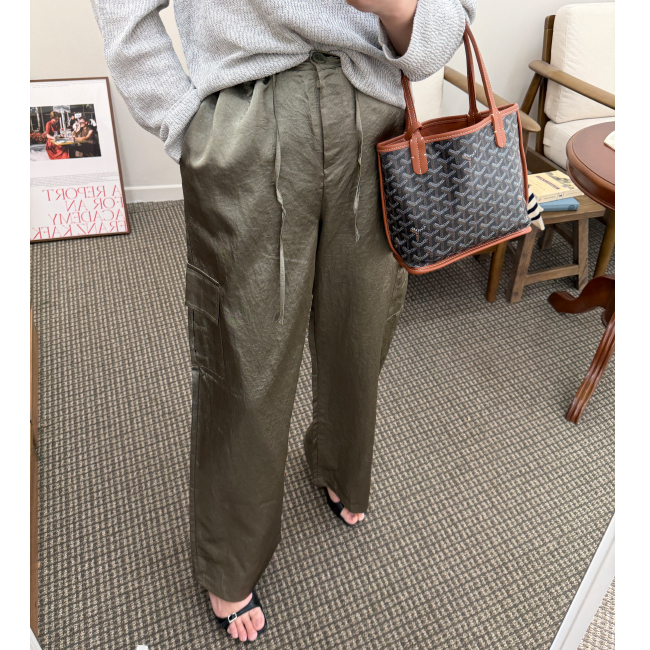 룩의 분위기를 업해주는 팬츠를 소개해드려요,매끄러운 샤틴소재로 분위기가 느껴지는 제품인데요,허리스트링으로 사이즈조절이 가능하며,맨투맨이나 티셔츠,등 심플한 상의와 매치해주시면네추럴한 룩을 완성해주어요,여유진 라인으로 다리라인을 날씬하게 연출해드리며,포켓디테일로 페미닌한 무드를 어필해드립니다,세련된 아이템으로 사심담아 추천드릴게요,컬러는 블랙,카키 총 2컬러로 준비해보았구요사이즈는 프리사이즈로 25-30사이즈까지 추천해드리며,정확한 사이즈는 상세표를 참고해주세요,