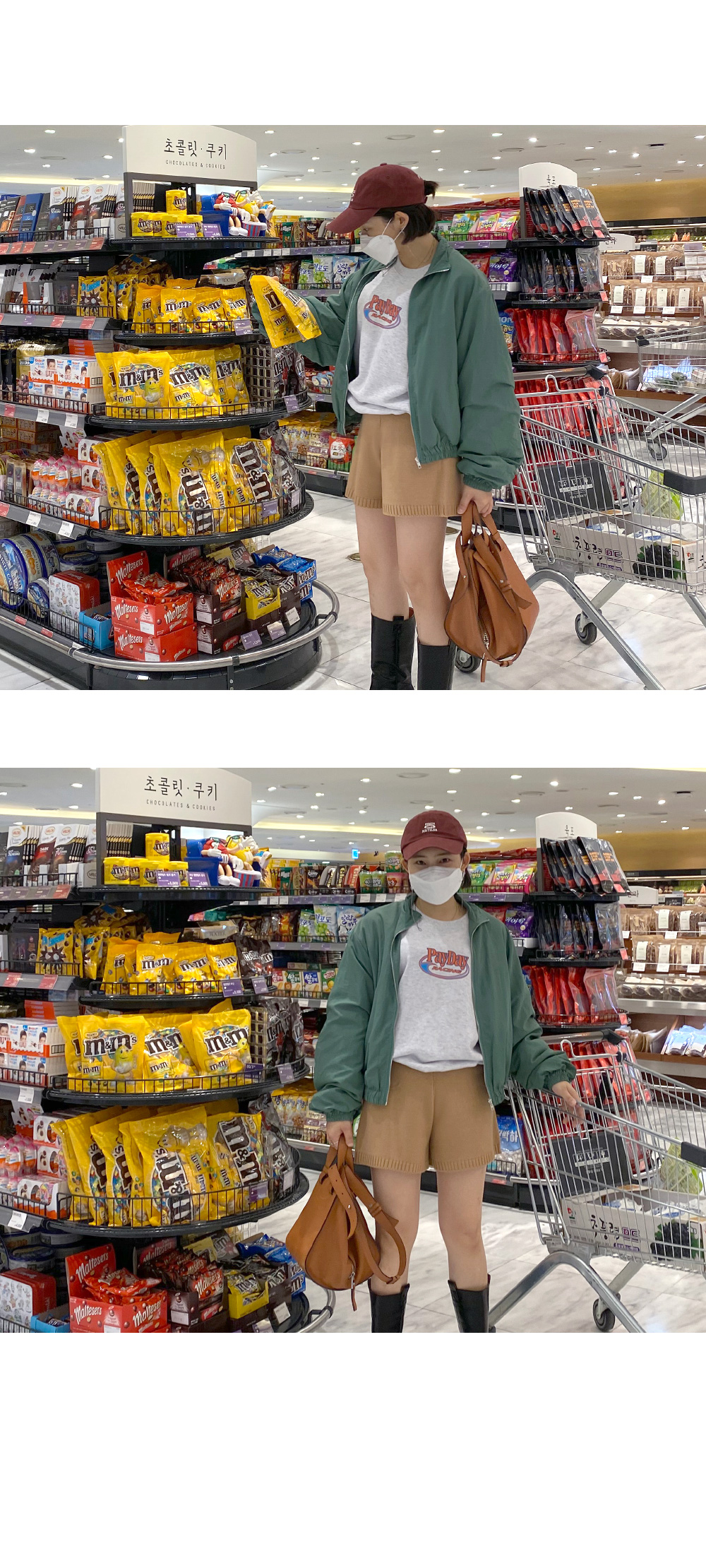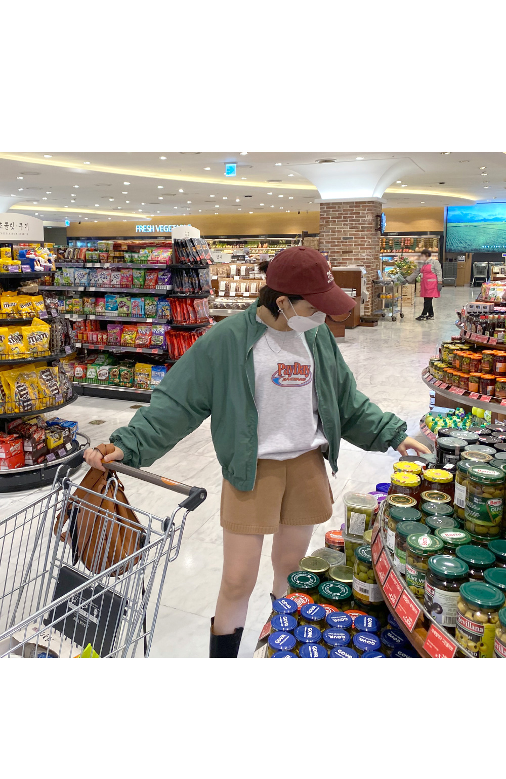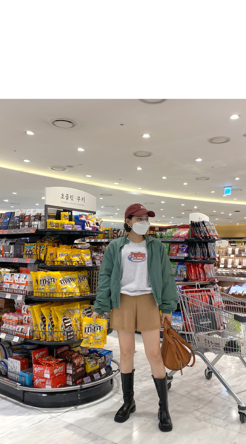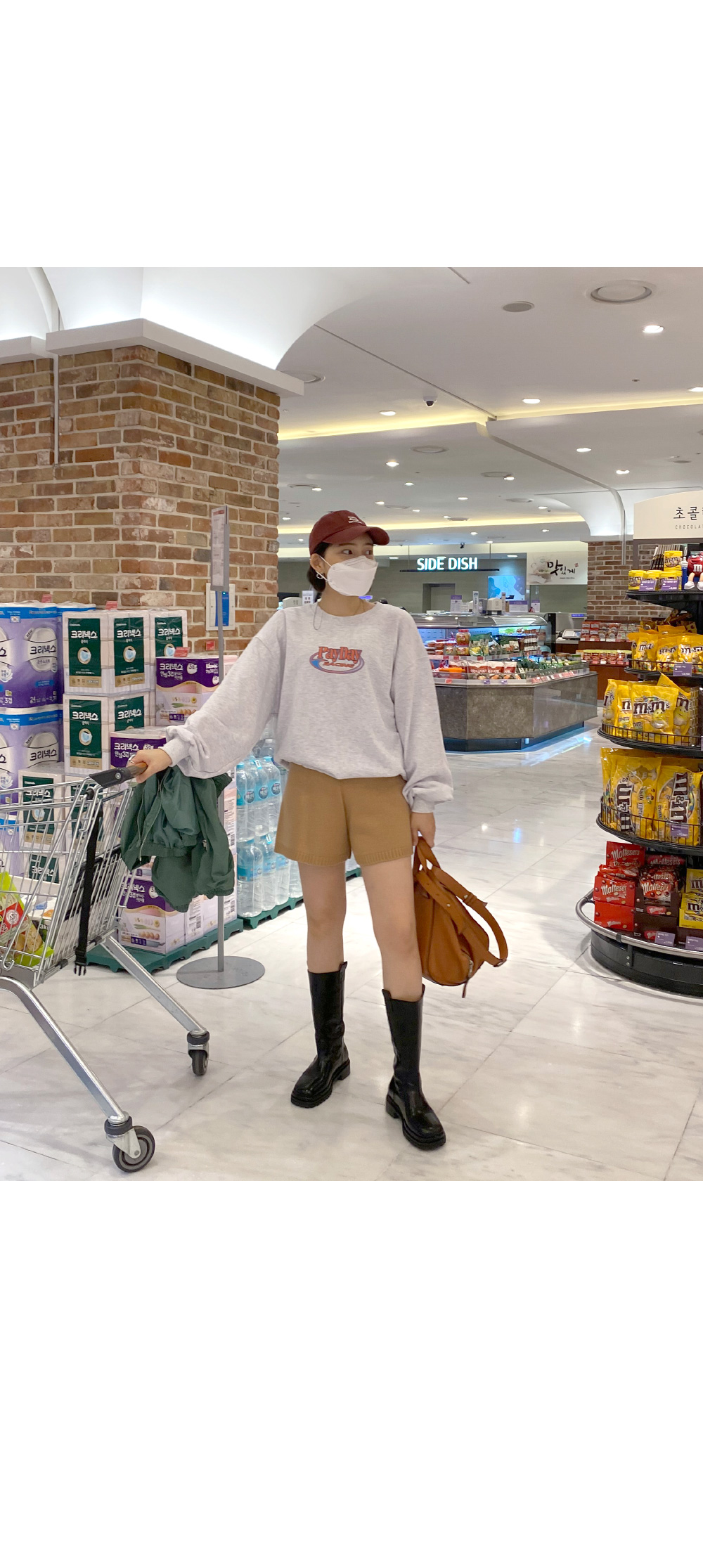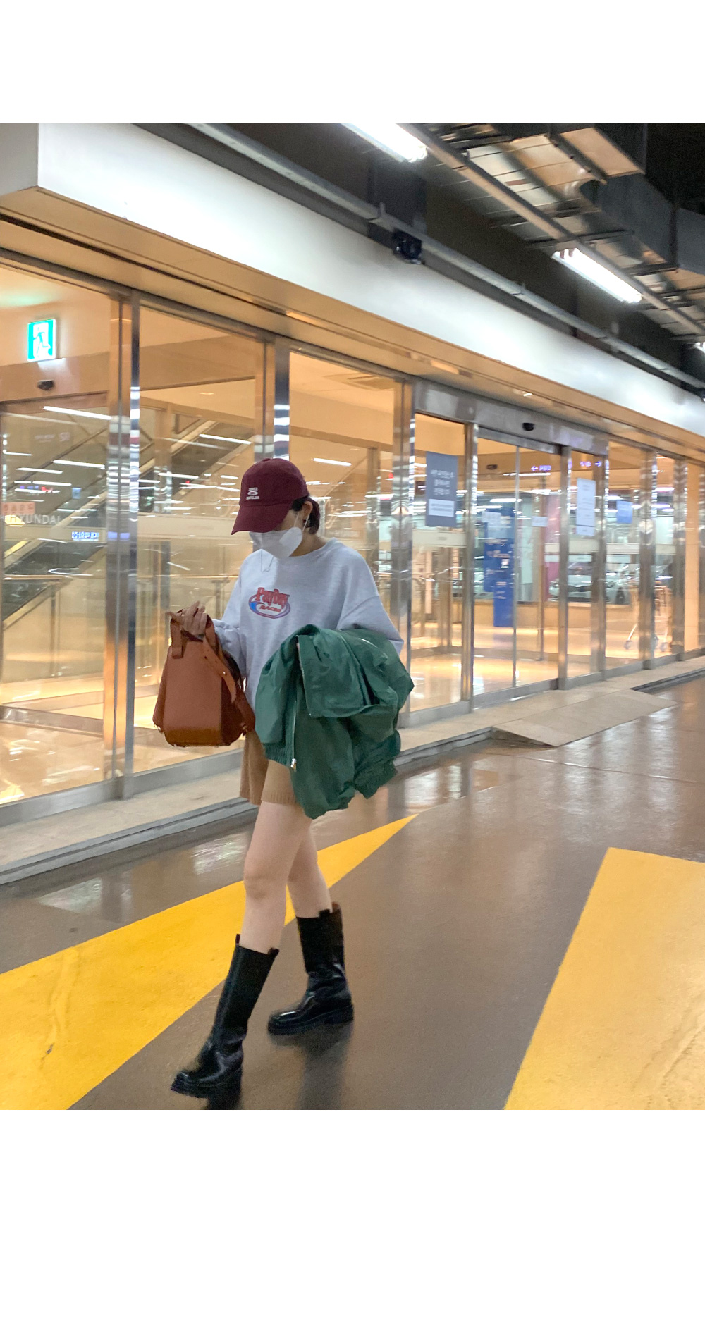 메릿 셔링 야상 _ 카키레나 맨투맨 _ 백멜란지니트 팬츠 _ 다크베이지몬드슈 부츠 _ 블랙마레마레 모자 _ 와인체인 마스크걸이 _ 실버