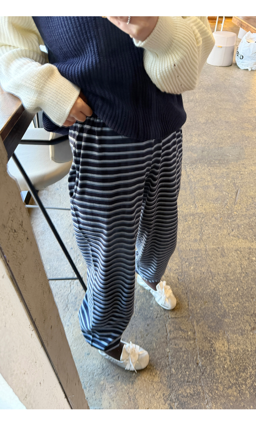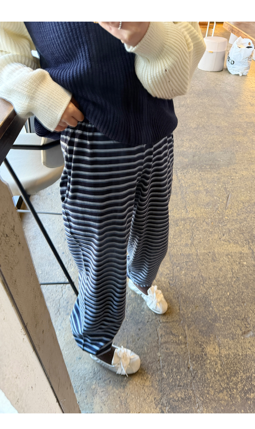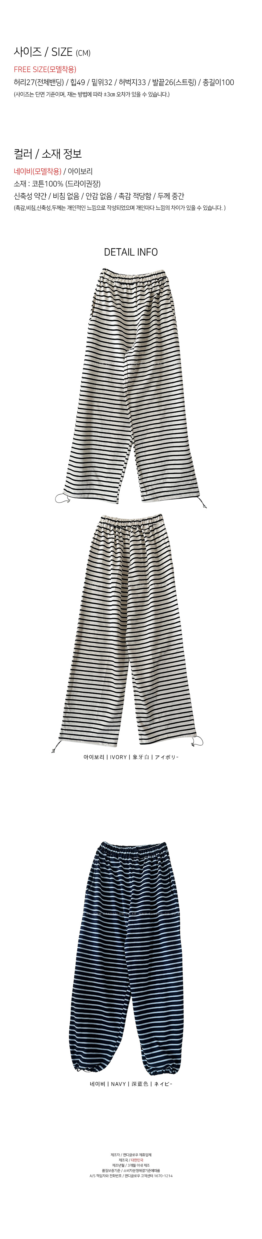 허리밴딩으로 편안한 착용감을 선사해주며,스트라이프패턴으로 은은한 포인트가 되어드려요,밑단 스트링이 마련되어 일자핏부터 조거라인까지 투웨이 실루엣이 가능하며,